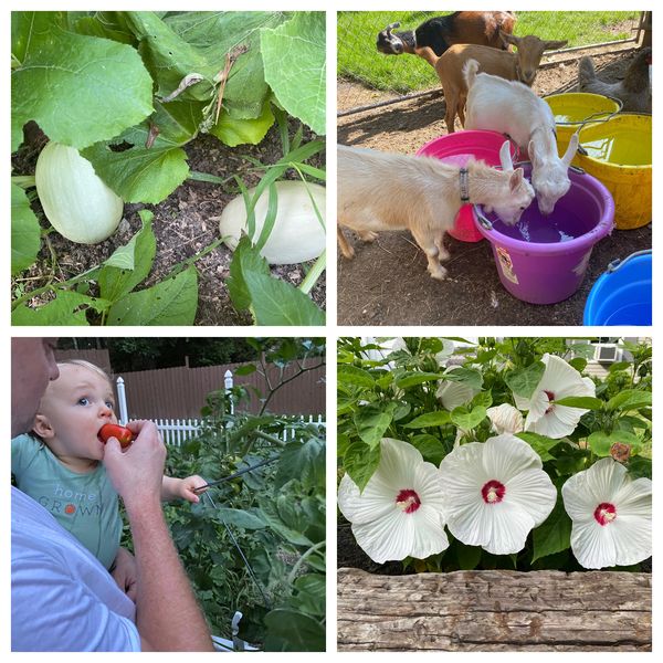 Each spring/summer we grow lots of snap peas, green beans, zucchini, peppers, squash, corn, potatoes and tomatoes!